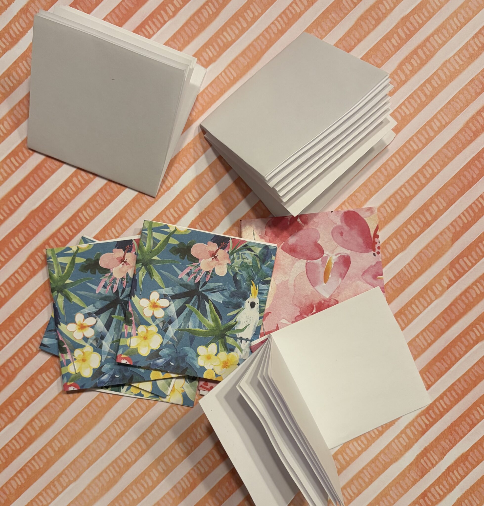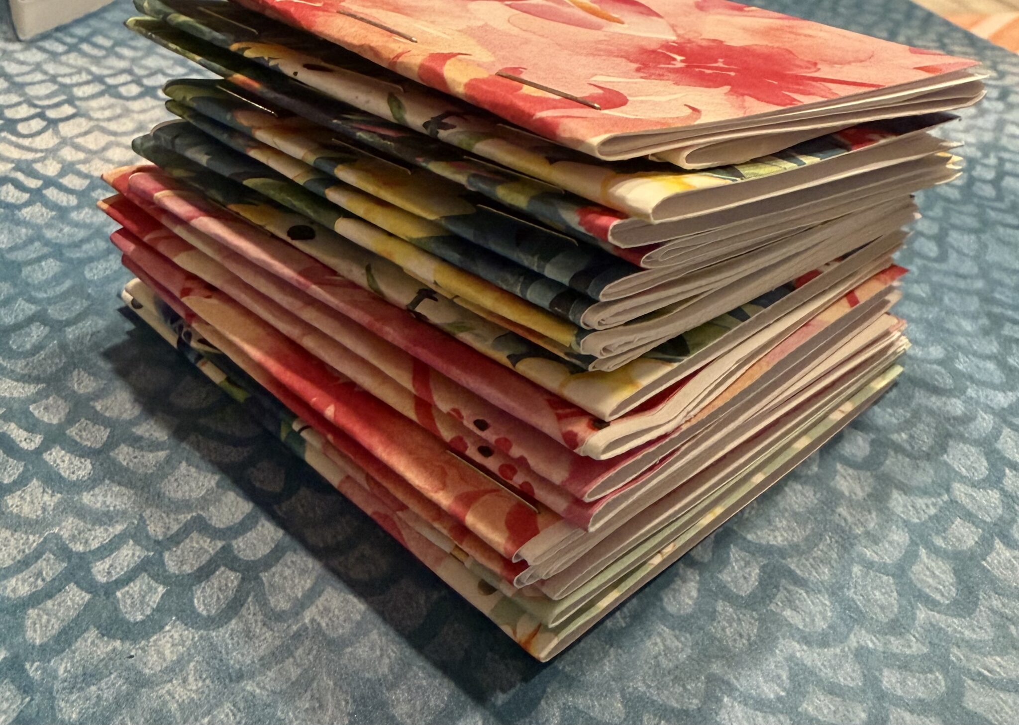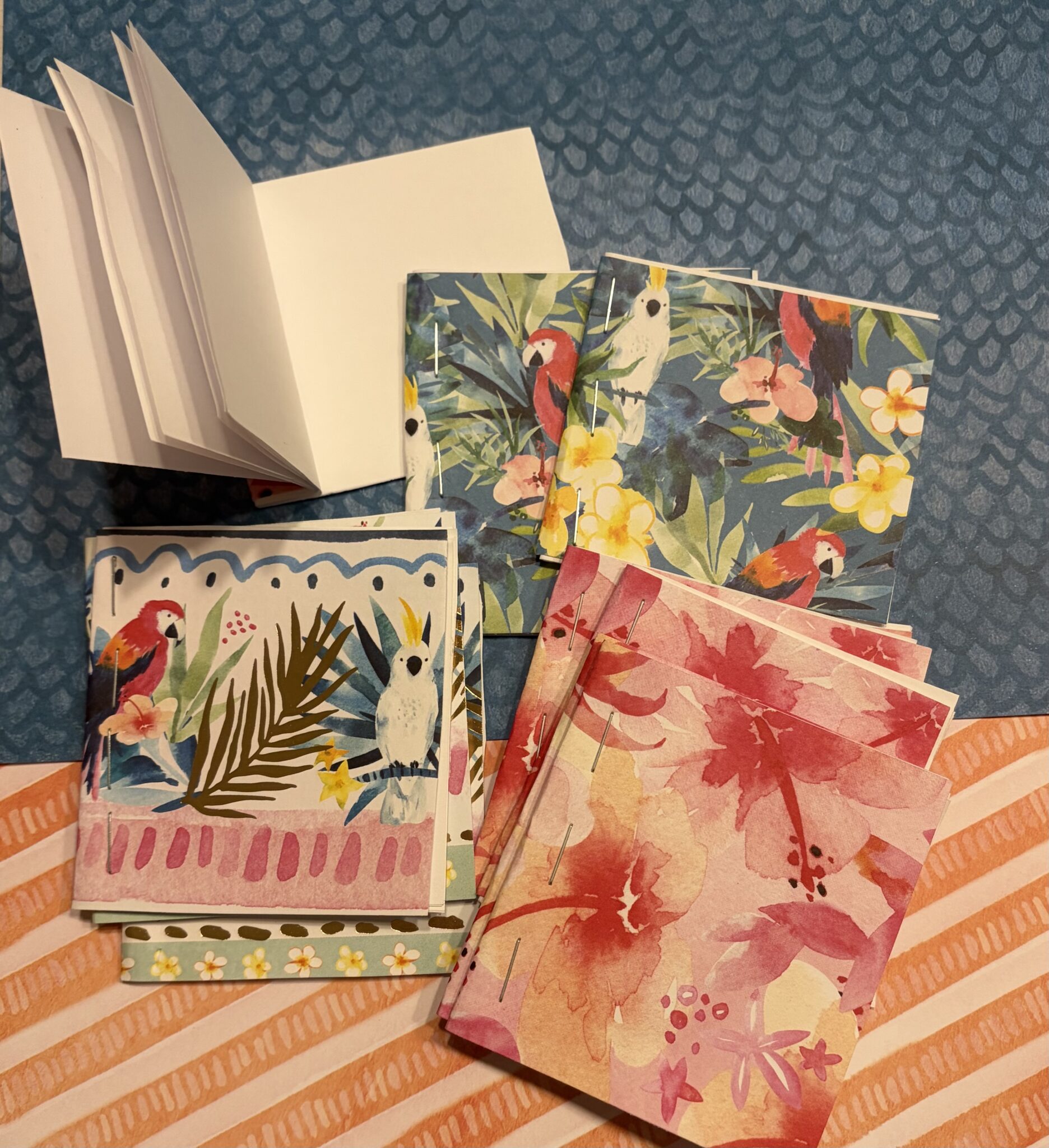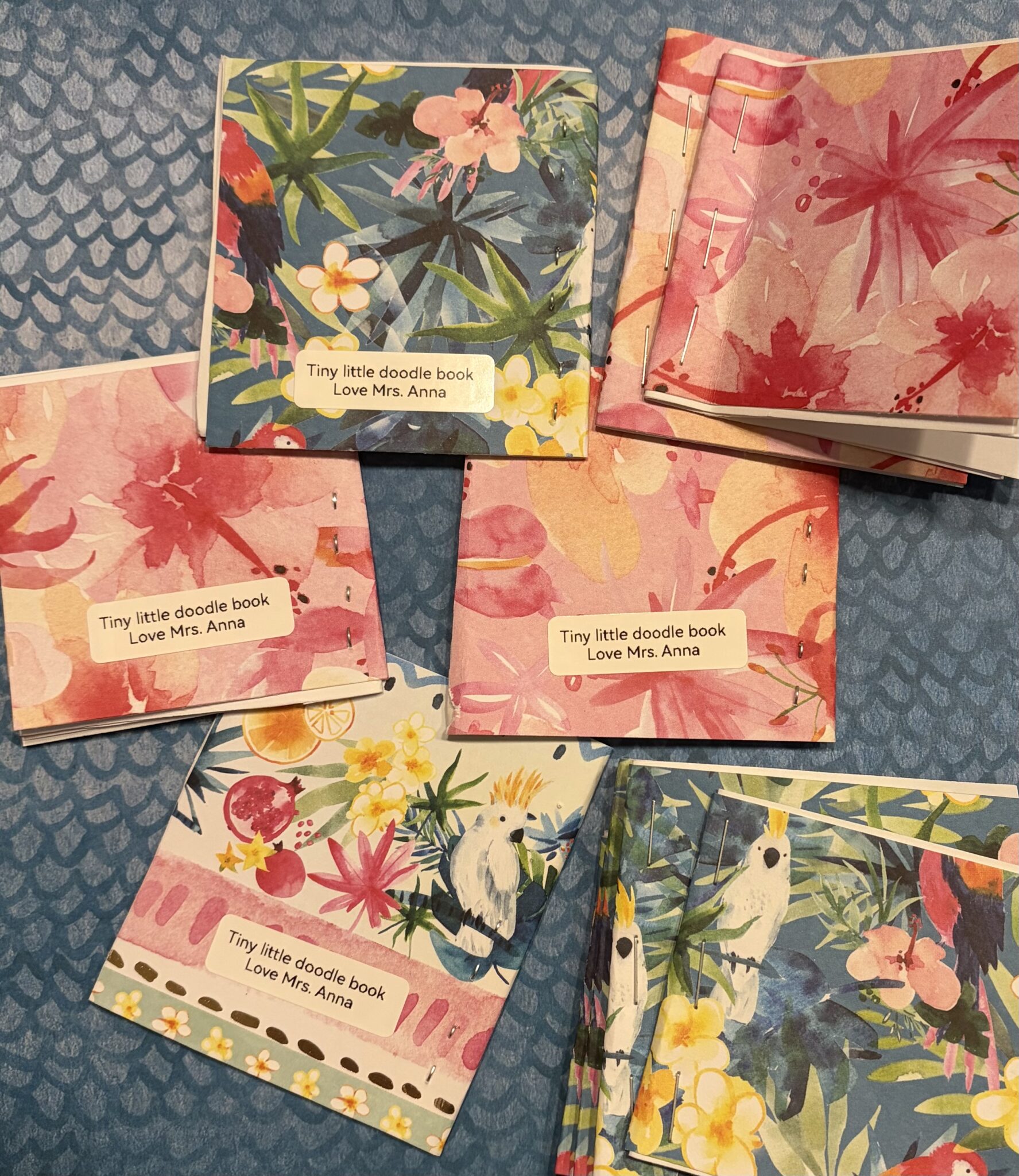 I had white paper, colored paper, and pretty printed paper, so I decided to make the children little tiny doodle books. I took several sheets of white paper—about three or four stacks—cut them into four strips, and then cut the strips in half. I stacked five to six sheets together and folded them into a little book. I did the same thing with the decorated paper to create covers, then stapled everything together. I even used my label printer to create a little blurb for the back.